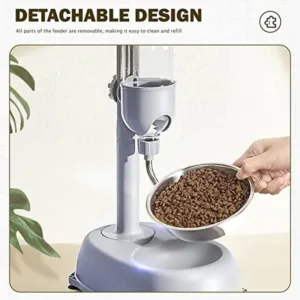 All parts of the feeder are removable, making it easy to clean and refill.  You no longer need to pick up spilled food or water, and the detachable design is easy to take on the go so your pet can easily drink clean water and eat the same food outdoors!
