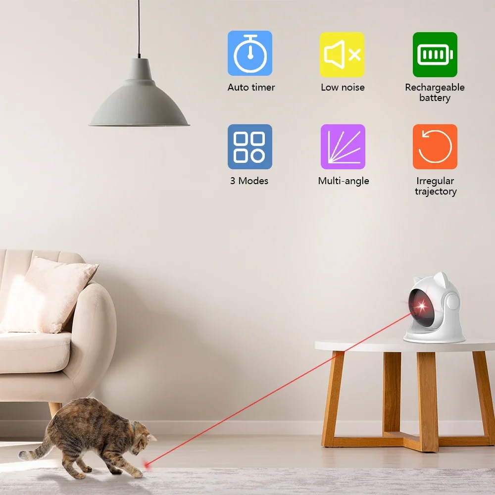 3 speed modes:umosis automatic cat laser toy has 3 adjustable speed:fast&slow mode mixed( blue light); slow mode(purple light); fast mode(yellow light).The interactive cat toy will meet the exercise of different cats