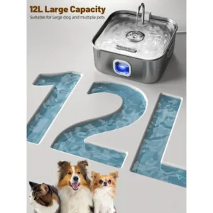 12L Large Capacity: Say goodbye to messy water bowls and constant refilling. The large water fountain for dogs inside with the 12L/3.2Gal large capacity, it’s easily meets the needs of all breed dogs or multiple pets drinking water at the same time. You’ll spend less time refilling it and more time enjoying quality moments with your furry friend.