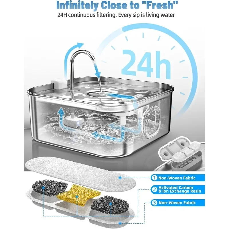 4-Layer Filtration System: The stainless steel pet fountain uses 4-layer filtration systems. The carbon filter consists of high-density filter cotton, activated carbon, and ion exchange resin, and there is a pre-filter sponge on the pump. They offer various purification functions, from trapping hair and small debris to softening hard water and filtering out invisible particles, providing pure and healthy water for your pet.