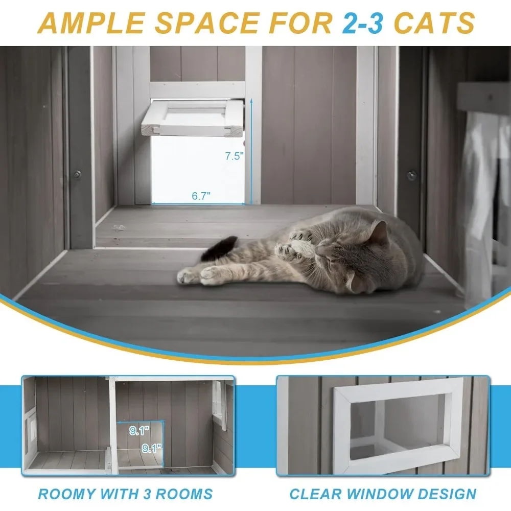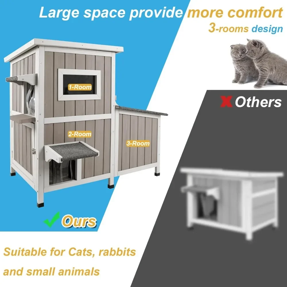 3 ROOMS WOODEN CAT HOUSE IDEAL HOME FOR INDOOR & OUTDOOR CATS