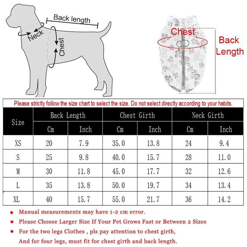 2.Please Choose Larger Size If Your Pet Grows Fast or Between 2 Sizes For the two legs Clothes,