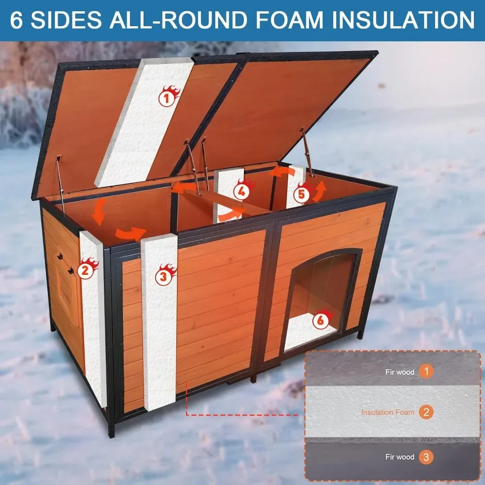 • 🔥【Insulated Dog House】Built to withstand harsh weather conditions, 6 panels of this outdoor dog house are made of a 0.39-inch thick fir wood, 0.47-inch thick styrofoam interior, and a 0.12-inch thick plywood.The foam insulation is in the middle of the wood. The elevated waterproof design and slanted roof ensure your pet stays dry and comfortable.