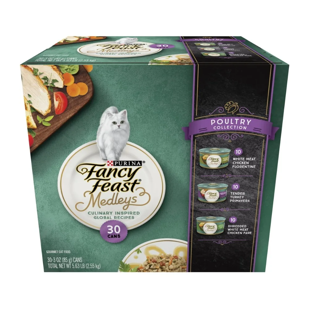 [‘Purina Fancy Feast Medleys Wet Cat Food Variety Pack Poultry, 3 oz Cans (30 Pack)nRecipes with tender white meat chicken and turkey deliver delicious flavornAccents of garden veggies add an artful touchnDelicate gravy or sauce provides a taste she lovesn100 percent complete and balanced nutrition for adult catsnEssential vitamins and minerals help to support her health and wellness’]