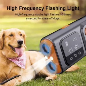 Features: 1. Powerful Ultrasonic Control: Designed with high-intensity ultrasonic waves, this dog repeller effectively deters barking. It features two modes-fixed frequency and sweeping frequency-suitable for different dog breeds and sizes, from 6 months to 8 years old. 2. High-Frequency Strobe Light: Equipped with a high-frequency strobe light that flashes 10 times per second, this anti dog bark deterrent device combines sound and light to scare away aggressive dogs, providing a dual deterrent effect. 3. Dual Deterrent Technology: This anti-barking device combines a powerful LED strobe light with ultrasonic waves to maximize deterrence. Its dual-action approach ensures enhanced effectiveness, giving you peace of mind during walks or outdoor activities. 4. Portable and User-Friendly Design: With its simple interface, this anti-barking device is easy to operate and carry. Its compact size makes it a perfect companion for dog owners on the go, ensuring convenience and ease of use. 5. Versatile and Safe: Suitable for various dog sizes and breeds, this humane dog repeller manages unwanted barking without causing harm or discomfort, ensuring safety for both the user and the dogs. Specification: Note: