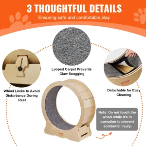 Versatile Cat Wheel: Featuring a locking mechanism to keep it steady, this cat running wheel is adaptable for interactive cat play, as a cat resting place, and as a furniture piece. It can be set to a stationary mode for cats running and spinning, allowing them to climb and take a nap. Cats can also frolic, chase, and keep themselves entertained!