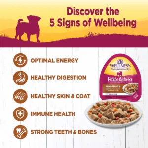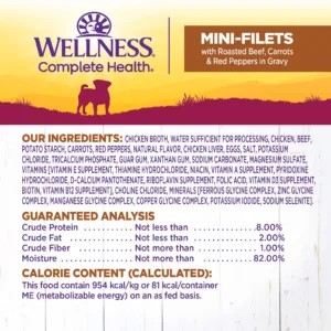 [“ENJOY A LIFETIME OF WELLBEING: High quality proteins and antioxidant rich veggies are expertly balanced to deliver a complete diet packed with the nutrients your small breed dog needs to thrivenWHOLE BODY HEALTH: Premium, nutrient rich ingredients support strong immune systems, optimal energy, digestive health and healthy skin and coatnSAVORY TASTE YOUR DOG WILL LOVE: Featuring tender filets of premium, roasted meat and cut veggies in a savory gravy for small breed dogs, contains no meat byproducts, fillers, or artificial preservativesnCONVENIENT AND EASY TO SERVE: A convenient, easy to open, ready to serve container makes mealtime quick and easynFIND THE RIGHT FOOD: Wellness offers a full range of foods to support your dog’s specific needs, including grained and grain free options, high protein recipes and limited ingredient diets for dogs with food sensitivitiesnPRODUCED WITH PRIDE: We are passionate about the wellbeing of pets; we pride ourselves in preparing recipes using the finest globally sourced ingredients, to craft delicious pet food recipes that consist of natural, wholesome, non GMO ingredients chosen for their nutritional benefits”]