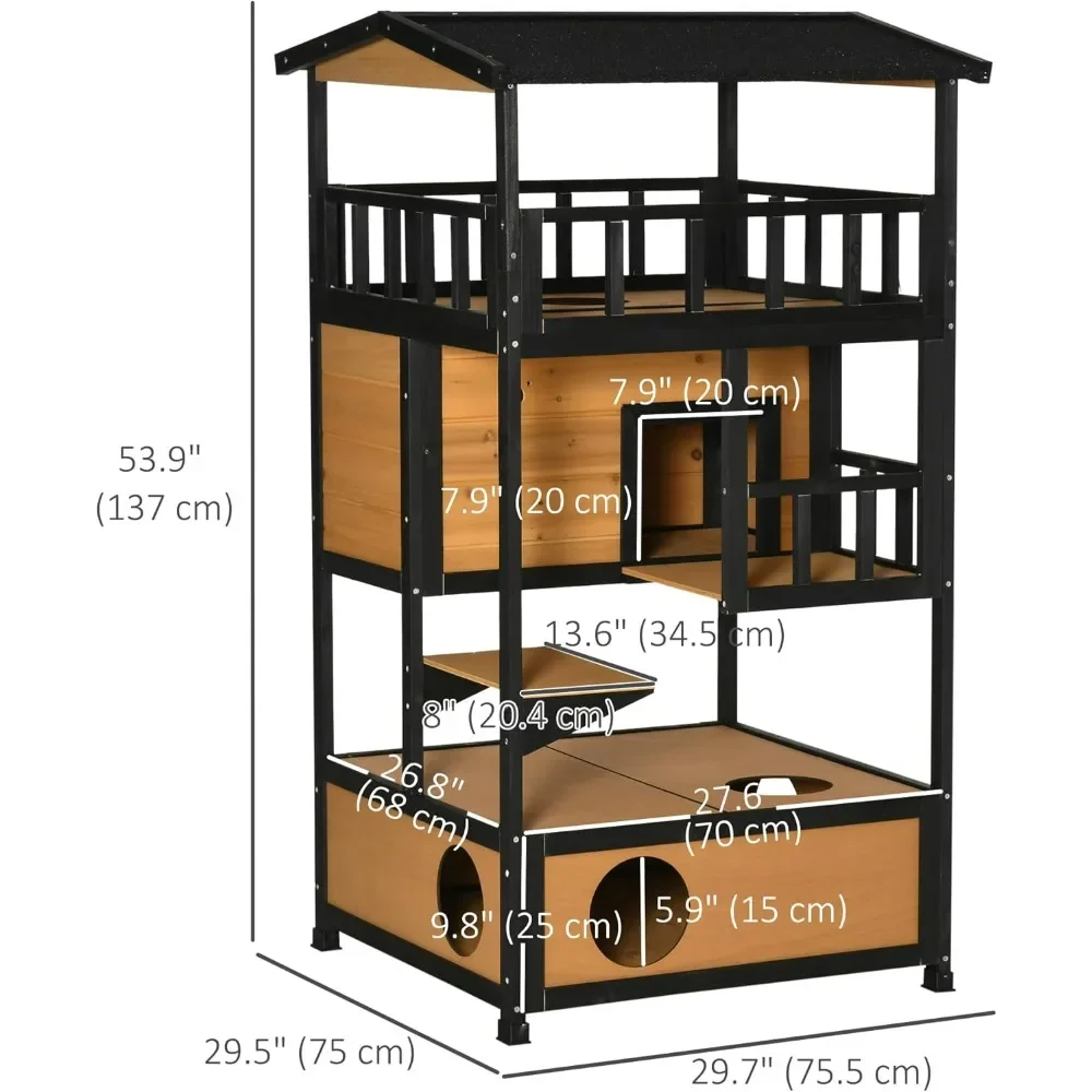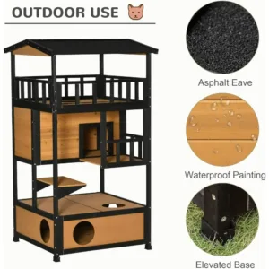 Outdoor & Indoor: The cat house & condos features an asphalt eave and raised floor, so if you use it outside and it rains, the water won’t damage the base.