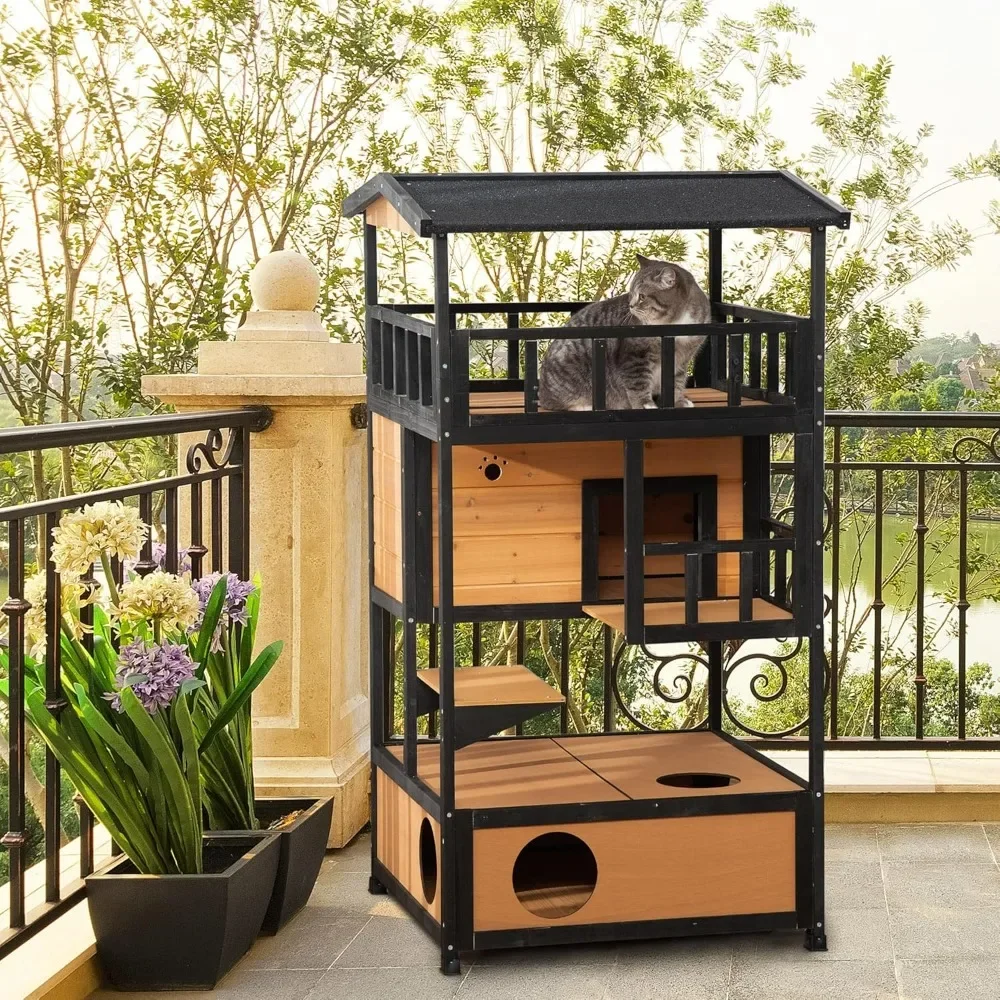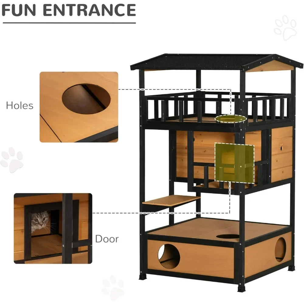Fun Ways to Play: This outdoor cat house has escape doors, jump platforms, and floor holes that provide fun for cats. It has a lot of room and a private area for relaxation time.